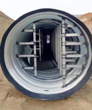 大波高的波纹板强度太高,难以弯曲成小直径的弧板。但若选用波高小于100mm的波形钢板,惯性矩低。若制成波纹钢管,管的径向刚度就会很低,管体变形量就会很大。此问题涉及和制约了钢结构管廊横断面结构形状的选择。
